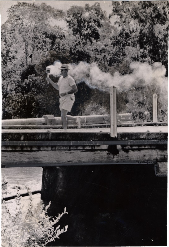 Blasting off the photo stock, this small heap of black-and-white wire photos conjures up the spirit and excitement of the 1956 Summer Olympic Games. Held in Melbourne, the games are represented by this handsome set of over forty 8x10's that cover everything from the lighting and running of the torch to the entire US boxing team to the torch runner asking for admission into the acropolis. In overall EX condition, a few of the pictures have necessary publishing marks.