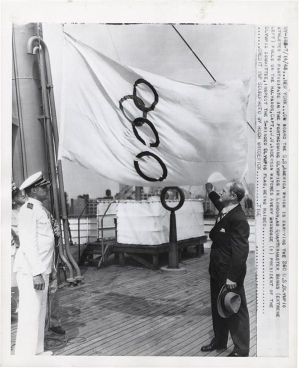An epic set of pictures detailing all the nuances and reach of the 1948 Summer Olympics in London's Wembley Stadium. Totaling over 90 photographs that vary in size, though most are 8x10's, the pictures paint a visual panorama of these turbulent games that saw some of the most ferocious rivalries in the game's existence. Among the black-and-white photos, highlights include fans watching the ending of the rowing session and a great shot of the US weightlifting team. Overall condition is EX.