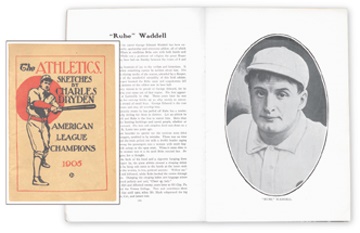 Connie Mack was just a youngster when this was printed--just look at the photo of him on page five! Exceptionally scarce fifty-page publication features sketches by famous artist Charles Dryden of each of the members of the A.L. pennant-winning squad with a short bio of each on the facing page. Eddie Plank and Rube Waddell are just a couple of the stars that took this team to the top. Vertical fold at center is barely noticeable. Book is otherwise solid and free of wear, EX.