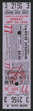 Connie Mack had retired a few years earlier, having created and destroyed two great dynasties in his half-century of work. But the history of the Philadelphia A's ended here, at Yankee Stadium Sept. 26, 1954. The next season would find them in Kansas City. Unused ticket is EX-MT.