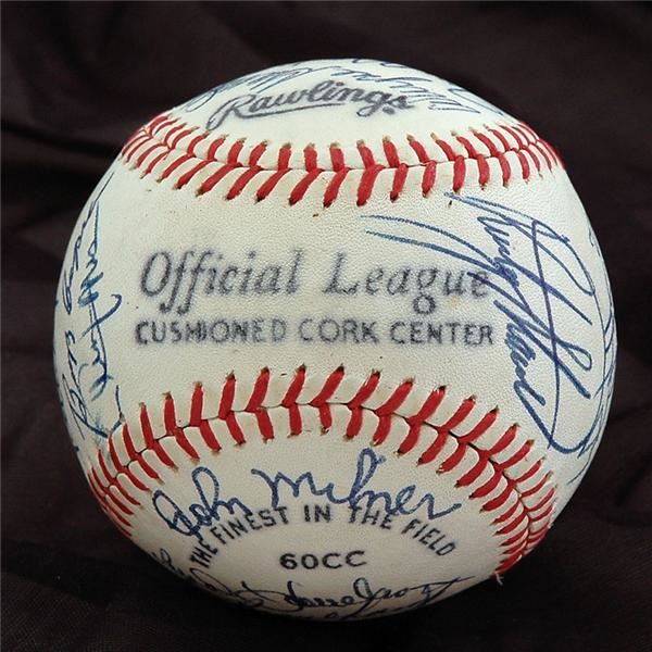 Rawlings Official League baseball signed in blue ballpoint by 26 members of the 1973 National League Champion New York Mets. Signatures include HOFers Yogi Berra and Willie Mays on the sweet spot, HOFer Tom Seaver, Ed Kranepool, Tug McGraw, Wayne Garrett, Rusty Staub, Bud Harrelson, Jerry Koosman, Jon Matlack, Felix Millan and others. Very clean baseball is NRMT with signatures that average a grade of 8.5. From Rusty Staub's personal collection, accompanied by his personal LOA and an additional LOA.