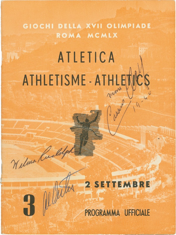 From the 1960 Summer Olympics, held in the Olympiad in Rome, Italy, a sports program signed by three American gold medalists. Orange-colored program with a picture of the Olympiad in the background of the front is signed by discus record-setter Al Oerter, sprinter Wilma Rudolph and young Cassius Clay, who won the Light Heavyweight division at the games. All three signatures are in blue or black pen, Clay reading “From Cassius Clay 19-60”. There is a light crease at the upper right corner of the program but otherwise it is in Near Mint condition. All three signatures were obtained in-person at the games and are rated 9/10. Oerter overcame a case of polio before the three-medal win and many say that Clay’s triumph at the games would be the spark that lit his amazing professional career. Both Oerter and Clay live on but Rudolph succumbed to brain cancer in 1994, a decade before she would be immortalized on a 23-cent postage stamp. A vintage piece of Olympics glory and each athlete’s personal triumph.