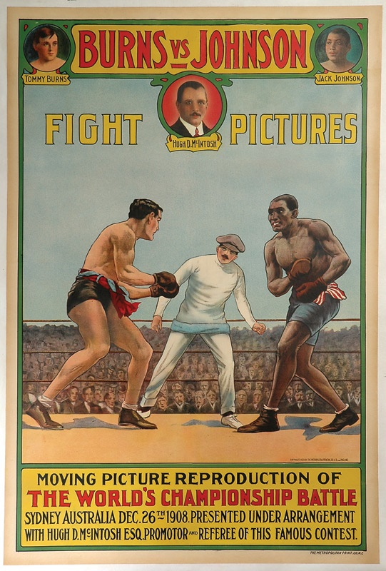 A jaw-dropping piece from a spectacular fight. This is a fight film poster for the 1908 Jack Johnson vs. Tommy Burns championship fight, a legendary match and one of the many times where sport has been used to openly challenge and defeat racism. In this case, Tommy Burns was brutally defeated along with it. With this victory Jack Johnson became the first African-American to win the coveted World Heavyweight Title, setting the stage for future greats like Sonny Liston, Cassius Clay and George Foreman.The colors are as vivid and clear as the day they were printed. Measuring 28" x 41", mounted on linen and is in EX-MT. The only thing preventing it from being NRMT is slight toning around the border. Extremely rare, one of only two known with the other being in very poor condition. Without a doubt this is one of the most beautiful posters we have ever seen.