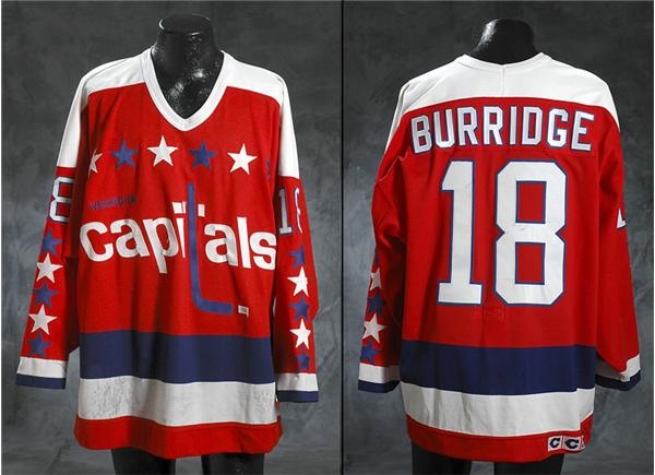 After an NHL career highlight as a member of the Stanley Cup-contending Boston Bruins of 1988 and ’90, losing to the Edmonton Oilers on both occasions, left-winger Randy Burridge suffered a shoulder injury during his amazing 67 point (and building) 91-92 season with the Washington Capitals, his NHL career high. His next season was plagued with injury. Still, the daggered stick marks on its front and sleeves, as well as the hole on the sleeve, and pilling on inside of sleeves, gives this starry #18 a lot of character. With tackle-twilled lettering and numbering (stringy "Capitals" on front), a “Burridge” nameplate on verso, and a Maska care tag, with blue-penned “54”, in collar.