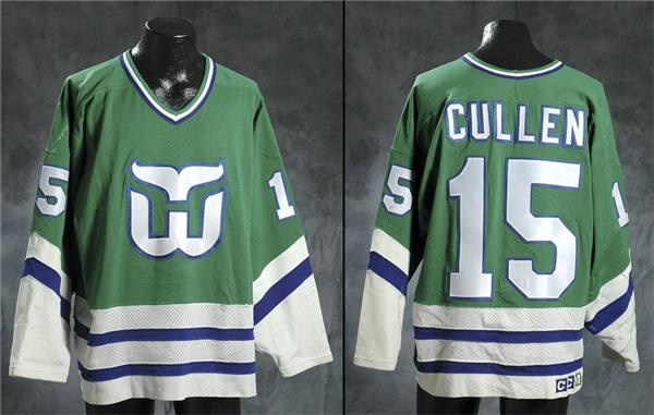 White-finned, sea green sweater from center John Cullen, an impressively abused Hartford Whalers jersey, with stick marks on front and sleeves, red board marks, pilling inside elbows, holes in sleeves, and some front seam disintegration. Cullen was mid-season from the Penguins, offering this garment to opposing teams and his own aggressive play for a Whaler team on which he accumulated 16 points the remainder of 1990-91 - added to his exploits as a Penguin in Pittsburgh for most of that season - a combined career high of 110 points! A tough player and an even tougher sweater! Blue-sharpied “15” and blue-ballpointed “48” on same CCM tag in collar.