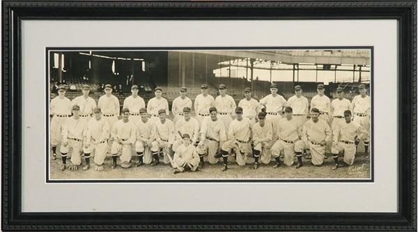 Atmospheric vintage photograph presents the 1933 American League champs, the 99-53 Washington Senators, in a team photo that has signatures from all 26 players, including Luke Sewell, Al Schacht, Heinie Manush, Moe Berg, Sam Rice, Goose Goslin, Joe Cronin, Ossie Bluege, Earl Whitehill, Nick Altrock, and the rest of the gang. The New York Giants beat the Nats in what would be the last World Series hosted in D.C. Photo itself is a little rough around the edges but has been ornately framed and double-matted for an appearance of EX. Signatures in fountain pen average 6/10. Measures 27x15”. LOA.