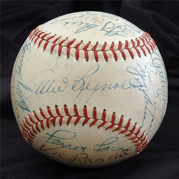 This Spalding ONL Giles baseball bears 29 blue and black ink signatures from the 1952 American League All-Star team, from the first All-Star Game to be called for rain (five innings). Signatures include HOFers Mickey Mantle, Yogi Berra (signed twice), Nellie Fox, Phil Rizzuto, Casey Stengel, Bob Lemon and Larry Doby, as well as Allie Reynolds (sweet spot), Hank Bauer, Eddie Robinson, Ferris Fain, Vic Raschi, Bobby Avila, Vic Wertz, Ed Yost, Dom DiMaggio, Eddie Joost, Jack Jensen, Jim Hegan, Al Rosen, Bobby Shantz, Gil McDougald and a few others. Ball is toned with minor soiling, signatures grade an overall 7.5 to 8.