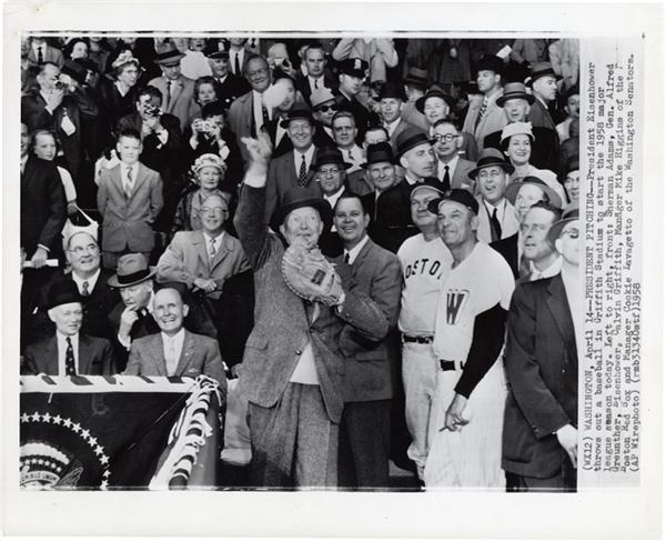 A small set of three photos showing president Dwight D. Eisenhower throwing out the first pitch at the beginning of both the 1958 and 1960 major league season at Griffith Stadium. The set includes two 7x9"s and one 10x8", all of which are in EX condition.