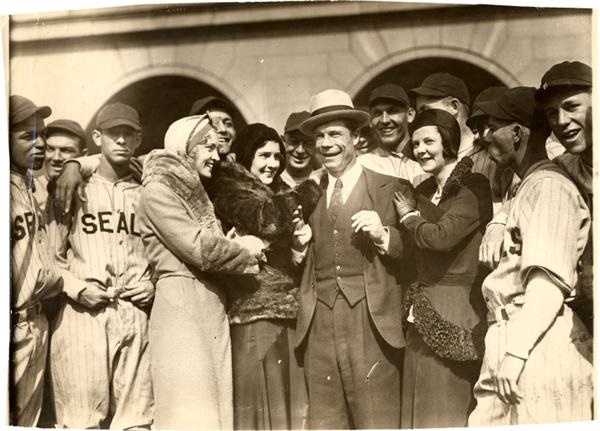 Famed Hollywood actor along with actresses Mia Marvin, Ruth Matteson, and Jean Reno. Best of all they are joined by the 1931 Seals including a very dark skinned player at far left. 12.5x8.5”. EX-MT.