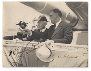 The Commander in Chief talks strategy with his Chief of Naval Operations, Admiral W.H. Handley. Autographs from each are in nice black ink. Photo itself is EX-MT.