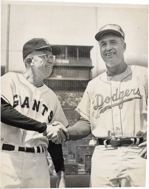 Dodger and Giant imports are represented by their managers Bill Rigney and Walter Alston. This is the first ML game ever at the old PCL park and ironically is between the two teams new to the West. Ruben Gomez pitches an 8-0 shutout and the Giants set an attendance record for Seals Stadium by drawing 23,192 fans. Rare Examiner print is 8x10”. Original newspaper article on the reverse is date stamped April 16, 1958, from the day after the game. EX-MT.