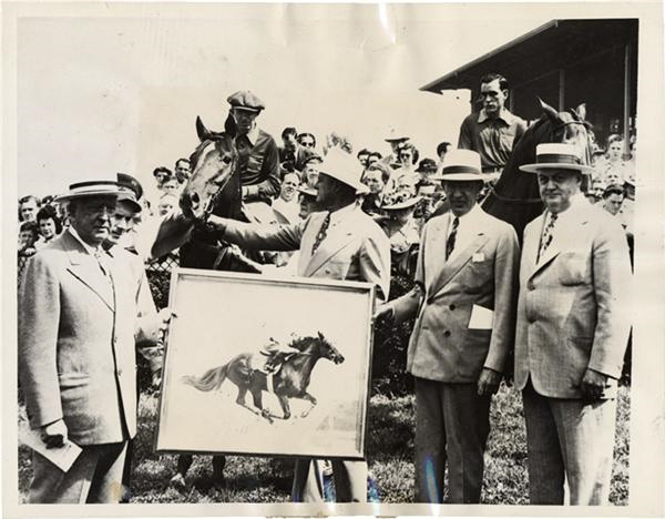 Whirlaway retires in festivities at Washington Park. He is joined by Calumet owner Warren Wright, Pinky Brown on mount, trainer Ben Jones, Ben Lindheimer and John Allen. 7x9”. EX-MT.