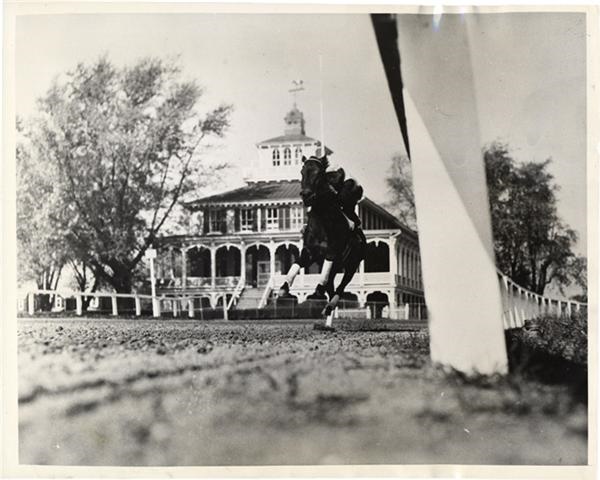 Whirlaway in winner’s circle with Eddie Arcaro aboard. Ben Jones his trainer holds him. Original newspaper article on reverse. 7x9”. EX-MT.