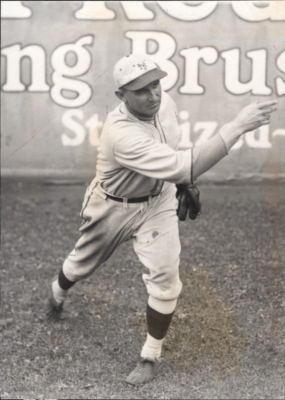 Three photographs of Carl Mays, the Major League pitcher best known for killing Ray Chapman with a pitch to the head. A 3.5"x5" print from 1926 has Mays looking directly into the camera. 5"x7.5" print shows Mays in 1928 throwing the ball in a Mets uniform. A 5.5"x8" print with paper caption on the back pictures Mays at the beach with his son Dilly in 1928. It is missing a small portion from the lower left corner. Overall the photos are EX.