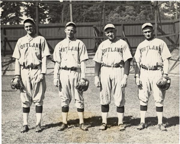 Mays is joined by catchers Billy Posdell, John Beck, and Fred Ortman. Original paper caption on reverse. EX+. About 8x10”.