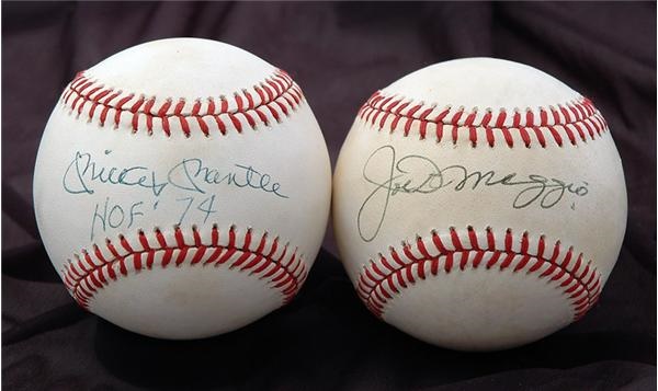Lot # 577: Mickey Mantle “HOF 74” Single Signed Baseball and Single Signed Joe Dimaggio