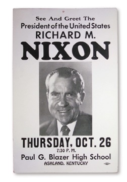 Advertises upcoming event to "See And Greet The President of the United States Richard M. Nixon" at Paul G. Blazer High School in Ashland, Kentucky. Were the Allman Brothers opening up for him? Heavy cardboard 22x14". EX.