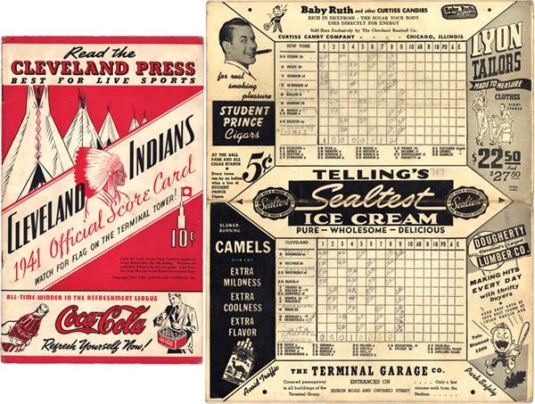 Historically, this 1941 Cleveland Indian’s scorecard chronicles and symbolically brings to a close (and thus, truly defines) the greatest hitting streak in baseball history - still, and forever, unbroken, that of Joe DiMaggio’s 56-game hitting streak. The game, scored in neat pencil, and won by the Yankees, would have been # 57, but Joe grounded out in the first inning, leaving this red 12-page booklet of that July 17th night contest a testament to DiMaggio’s greatness, and untouchable limit. In VG-EX condition, the actual scorecard carries the penciled-in date, “7-17”. A legendary item!