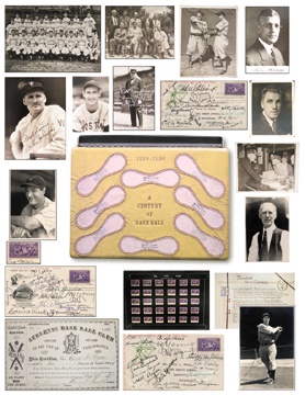 One of the top ten pieces we have ever offered in our fifteen years in the business of major sports auctions. This labor of love was put together by a prominent Philadelphian who had money, access to the players and a love for the game. Throughout the season of 1939 (could you pick a better year?) Evans put together this incredible two-volume treasure chest as a salute to the Centennial year. These magnificent 16x20x4" albums are titled on the covers in gold, "1839-1939 A Century of Baseball." Bound in the same yellow leather from the 1939 "Night Game" baseballs, they are custom-made with the sewn in hides of Ford Frick & William Harridge Official baseballs. There are a total of over one-hundred pages in these two steel-bound volumes. Pages themselves are 14x19" in heavy black paper and all of these relics are affixed with four corner mounts which has preserved them for eternity and have not damaged them in any way (quite the contrary). Each page is a tribute to some area of the game and this magical season. The major receptacles for signatures are the 1939 first day covers, George Burke photographs, and the 1939 baseball U.S. postage stamps. But there is something that makes these stamps better. Each is affixed to a white sheet slightly larger at the bottom and is signed on the white giving them far better contrast and a far more attractive device.