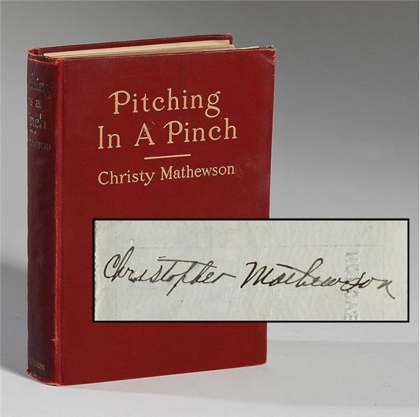 An inaugural member of the Hall of Fame, pitcher Christopher “Christy” Mathewson was one of the great players of the infamous dead ball era. Offered is a one-of-a-kind cancelled royalty check signed by the legend and folded inside a rare copy of Mathewson’s noted instructional book “Pitching in a Pinch” which was published by G.P. Putnam’s Sons in 1912. The earliest known check signed by the player during his sixteen-year career and one of a few documents where he signed his full name, the priceless item is taped upside-down on the book’s title page. Under a protective plastic sleeve, the book’s cover is made of maroon cloth with gilt author’s name and book title on the front. Worn and serrated in several places including the cover of the backstrip and top, the inside hinges of the front and rear have been repaired with clear tape. Both an advertisement and a picture of John McGraw have been slightly repaired with clear tape and placed into the front of the book, though are not affected besides a slight chip on the lower edge of the photo. Only four days prior to his 33rd birthday, the check is dated August 8th, 1913, to the mythical New York Giant. The book itself is in fair-to-good condition. An unbelievable find and crucial piece of baseball history.