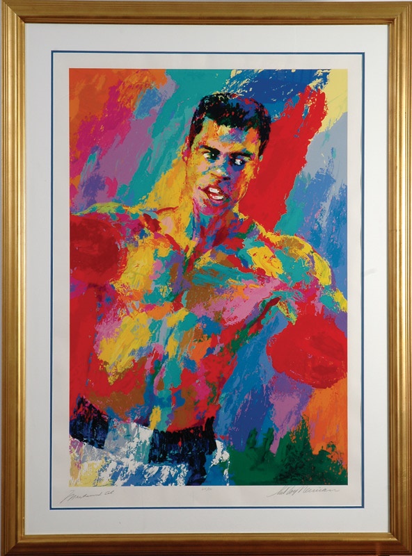 It’s all quintessential LeRoy Neiman! The illustrious sports artist daps and patches Muhammad Ali’s torso with fragmented, vibrant colors, and chromatically broadstrokes the environs at the champ’s back, but ironically it is the white of Ali’s sclera, and teeth, that truly draw the viewer in - as Ali’s dark pupils focus left, the same direction as his lower slacked jaw, as a right, red-gloved force is about to be unleashed. Signed at the bottom in 9/10 pencil by Muhammad Ali and Leroy Neiman, this serigraph, tastefully double-matted and gold framed, measures 41 ? x 55 ?”. Titled “Muhammad Ali - Athlete of the Century,” and dated “February 2001.” Number 615/850. NRMT.