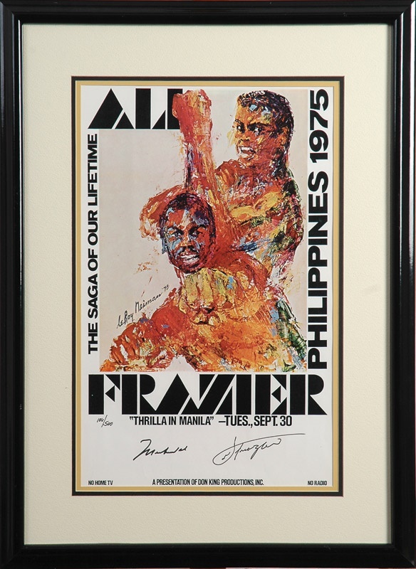 “A Presentation of Don King Productions,” the “Thrilla in Manila” was the closed-circuit event of the sports world in 1975, matching up for the third time Joe Frazier and Muhammad Ali, this time in the Philippines. The fight was called as Frazier could no longer see, but it was the winner Ali who fainted in the end. Truly thrilling, this beautiful poster is triple-matted and framed to 22 x 30”, and signed by these two champions, both in black Sharpie, rating a 10/10. Limited edition is 106/500. Comes with pictures of both fighters signing. NRMT.