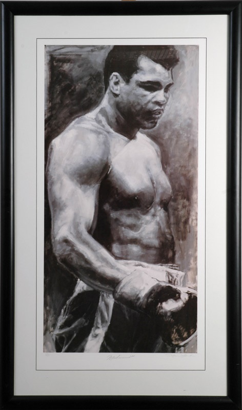Rich and monochromatic work by Stephen Holland depicts the larger-than-life figure of Muhammad Ali as vulnerable, complex and mature. Signed by Ali, and Holland, in 9/10 pencil at bottom. This framed and matted lithograph is a limited edition (592/1000), and measures 31?” x 53”.