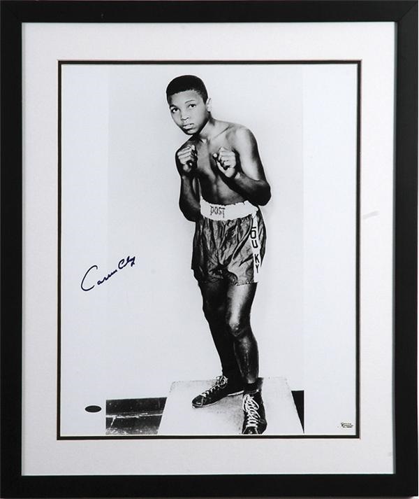 Charming and endearing 16x20" photo, captures The Greatest as a boy, fists up and stance set, Ali signs in an amazing 9/10 blue Sharpie, “Cassius Clay.” Sharply doubly-matted in black and white, and with black frame measuring 22x26", this is a special image, magisterial as well as understated, from the innocence in his eyes down to his seemingly over-sized shoes. Includes LOA.