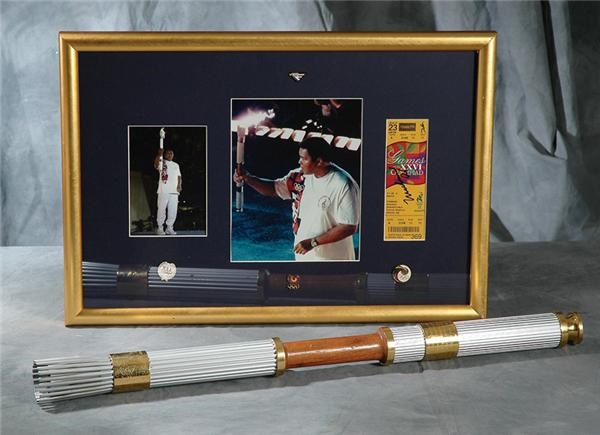 An emotional and affirming event at the 1996 Summer Olympics in Atlanta, Georgia, was the lighting of the Olympic flame by 1960 gold medalist and athletic icon Muhammad Ali. An Olympic torch from those Games is offered here, an aluminum and gold colored metal item, with wood handle and gold metal trim. It measures 31 ?”, and contains two gold bands, the one at top with the Atlanta Games logo, and the bottom one with all the Summer Games’ host locations and years engraved. Torch is EX-MT, and comes with framed display of two photos of Ali carrying torch just like this one, four pins and a ticket to the baseball event that is signed in 8/10 black Sharpie by Ali.