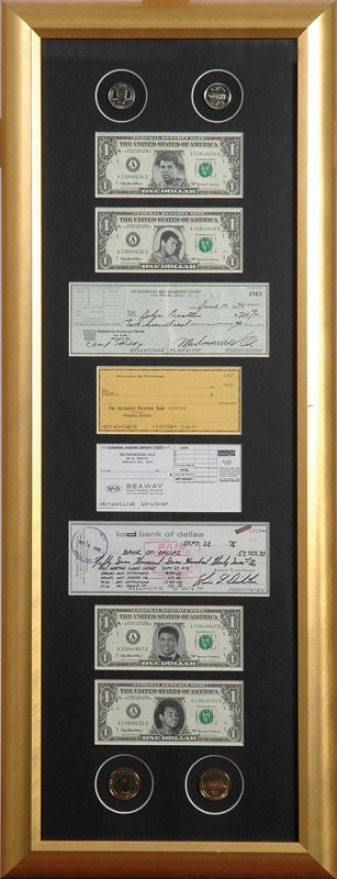 Gold-framed and immaculately black-matted display celebrating the Ali mythology with twelve pieces of monetary exchange, highlighted with the Greatest’ black felt-tip pen signature (8.5/10) on a “Muhammad Ali Training Camp” check, dated June 10th, 1974. Other items include a Bank of Dallas check written for the ticket sales ($57,737.30) to see the Ali-Norton fight of 1976; two silver Millennium coins (front and back displayed) with Ali’s likeness and print - “Makers of the Millennium - Muhammad Ali - Born 1942” - on front; four real dollar bills with Ali’s picture pasted over George Washington’s; a blank check from “Muhammad Ali Enterprises;” a “Checking Account Deposit Ticket” with Ali’s name and address printed on it; and lastly two gold-plated coins (front and back displayed) with Ali’s likeness and print - “The Battle of New Orleans - Sept 15th. 1978 - Ali the Greatest versus Spinks the Latest.” Measures 13 ? x 35 ?”.