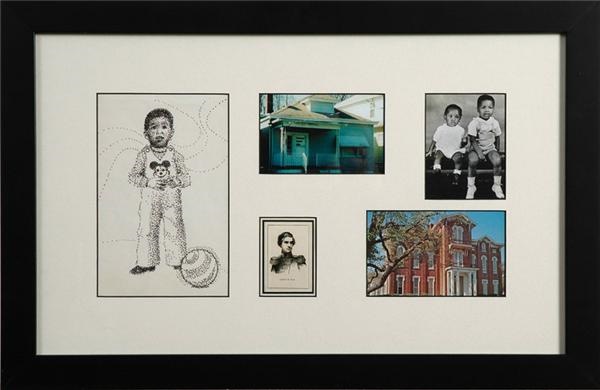 One of the finest pieces of Ali memorabilia that we have ever handled, this hand-tinted oval photograph captures the American icon and boxing legend in his 7th or 8th year, circa very early 1950’s, with Victorian-styled knickers and bow-tied shirt, already practicing that squint of intimidation we, and his opponents, have all come to know so well. Photo is in its original, ornate oval frame, measures 11 ½ x 17 ½”, and is EX. Along with this amazing elliptical masterpiece of Ali as a child, is a black-framed display (15 x 23”) of five images from the Greatest’s early days in Louisville, Kentucky, including b/w photo of him and a sibling, his childhood home and school, his namesake (a Jr. to his father, who in turn was named after abolitionist, Cassius M. Clay), and a pointillist drawing of Clay as an child. Amazing piece, with an equally intimate supporting pictorial.