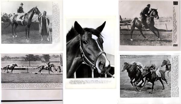 A great collection of horse racing photographs from the 1940s, 50s and 60s.  Photos of Mioland, Mr. Trouble, Pericles, Porterhouse, Olympic Zenith, The Pie King, Pellicle, Moccasin, My Request, Olympia and many, many more.  Singer Bing Crosby even appears in this collection.  Most prints are 8.5"x11" but sizes vary. Overall EX-MT, all are front captioned.