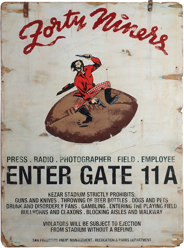 One of the nicest stadium signs we have ever seen. A beautifully-aged, double-sided stadium sign from San Francisco’s Kezar Park. Off-white sign has a drawing of an old 49er, guns blazing, in front of a football. Harkening back to the wild days of the West and San Francisco’s rougher years, the sign warns visitors that the park prohibits “guns and knives, throwing of beer bottles… drunken and disorderly fans, etc.” Painted on plywood measuring 36” x 46” with some wood exposed around edges and mounting brackets on the top.