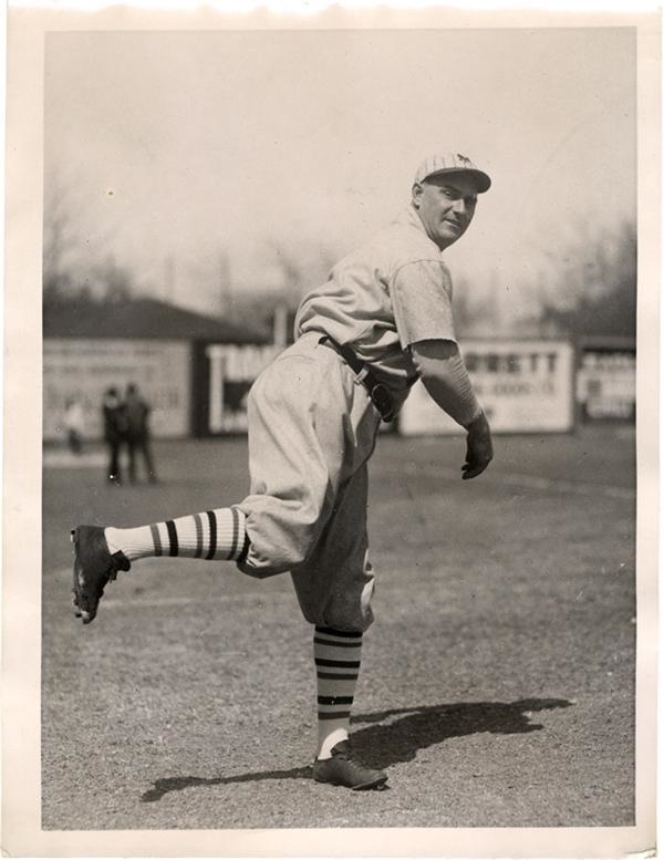 Extremely rare image of this burly twirler in San Antonio with the New York Giants. Of double no-hit fame, this is the first Toney wire photo we have seen. Original paper caption on verso. Corner wear otherwise EX-MT. 7x9”.