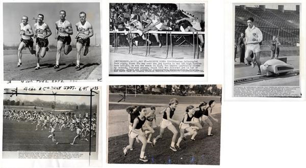 Track and Field in the 20th Century is given miles of coverage in this overabundance of photos (approx. 450), carrying images from the 1920s to the 1980s, including the Transcontinental Marathons of ’28 and ’29, the 1932 Olympic tryouts with Ralph Metcalf, many early Olympic tryouts, the USA vs. Poland dual meet of ’66 (huge file with gorgeous photographs), the 60s Examiner Indoor Invitationals and, best of all, plenty of collegiate action as well as personalities Evelyn Ashford, Greg Foster, Jim Beatty, Robert Hayes and others. Terrific wire photos average 8x10” with front captions and details on reverses including affixed original press clippings and paper captions, news service and date stamps, and production notes. Average EX. This has not been picked through and there is a ton of stuff here and there are many sleepers as we are not experts in this area.