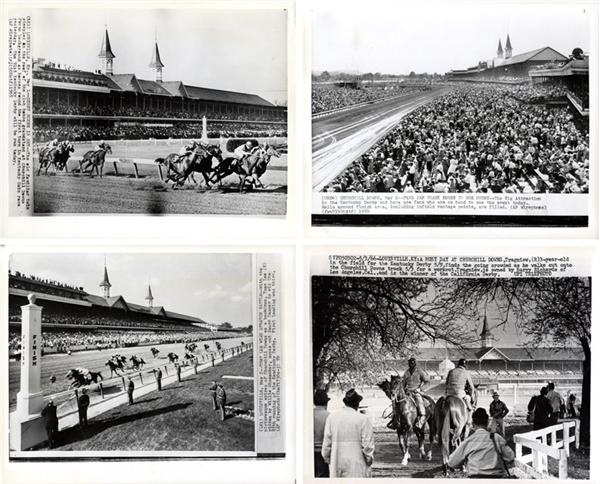 This is a fantastic file. Includes: 1929 bugler calling horses to the post, 1959 Tomy Lee win (10), Mark Klaine wins, 1963 preliminary, 1966 muddy track the week before, 1964 they’re off, 1960 winner’s circle, 1960 Derby, 1961 winner and finish (3), 1961 crowds and race (2), 1941 Whirlaway win (printed 1962), 1964 scenes and first turn (5), 1964 photo finish, 1965 crowds and first turn (3), 1965 fire (2), 1965 finish, beautiful 1966 view and more. Overall 8x10” and EX-MT.