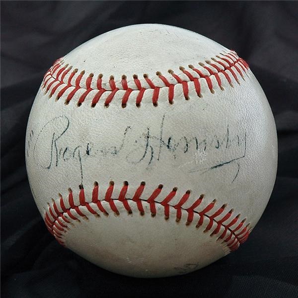 From the last decade of the legend's career with the Chicago Cubs, St. Louis Cardinals and St. Louis Browns, a baseball autographed in the script of the great Rogers Hornsby. This vintage Wilson Rogers Hornsby model baseball in EX condition is signed by Hornsby in blue ink on the sweet spot and was personalized on the side panel. Signature is graded 6/10. LOA included.