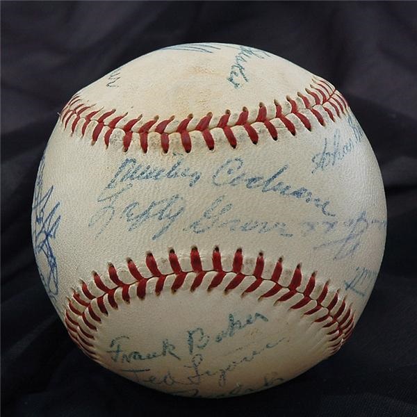 This mid-1950's Official American League baseball dons the signatures of 15 famed players and the imprint of William Harridge, the league's President at the time. Of the 15 players who signed the ball, 14 are now deceased Hall of Famers including Fred Clarke, Dazzy Vance, Harry Hooper, Duffy Lewis, Mickey "Black Mike" Cochrane, Lefty Grove, Chas. Gehringer, Jimmie Foxx, Gabby Harnett, Frank Baker, Ted "Sunday Ted" Lyons, Ed Walsh, Tris Speaker, Carl "The Meal Ticket" Hubbell, and Paul Waner. Famously red-stitched white leather, in excellent condition with blue pen signatures.