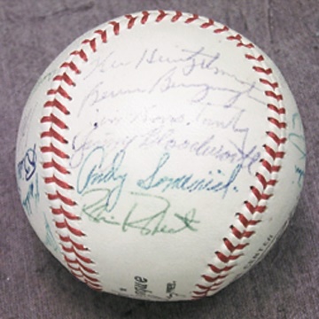 They fell to the Yanks in the World Series, but the Whiz Kids tore up the National League half a century ago. Twenty-three pennant-winners are here on a white ONL (Giles) ball, including Roberts, Konstanty, Innis, Sawyer and Church. No Ashburn. Ball and sig's are NRMT, though a few of the autographs are a touch light Probably signed at a team reunion in the early 1960’s.