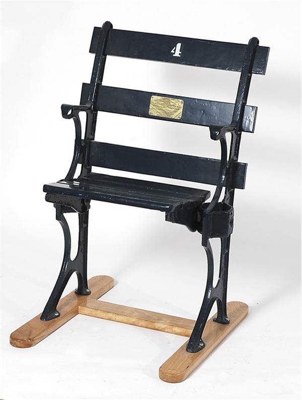 A seat from the now-demolished Ebbets Field. The floor-mounted seat has the number "7" painted in white on the top slant of the seat. Painted as blue but shows noticeable other paint jobs and the seat itself has been well-restored. The seat measures at 28"x21"x11" and is a historical piece for any fan of Brooklyn baseball and history.