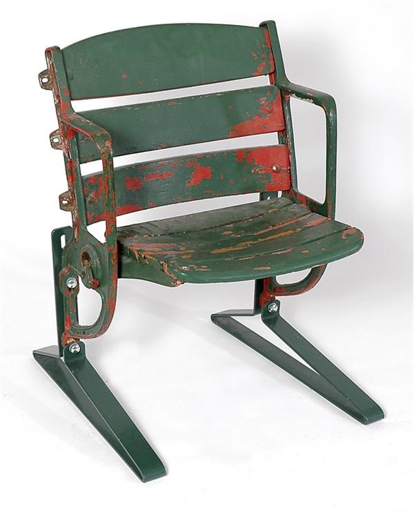 A wall-mounted seat from Sportsmans Park. The seat is original, painted green and including stanches. Shows noticeable, typical wear and measures at approximately 30x22x23".