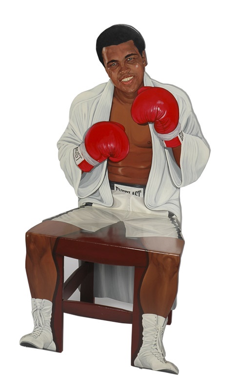 Light as Pop, yet realistic in its' portraiture, this Muhammad Ali hand-painted chair by Cathy Callahan celebrates the heavyweight champ and American icon’s jovial and fun personality as it is appropriately titled "Muhammad Ali Takes a Seat." This three-dimensional work in oil paint could be functional as a chair, though we would not recommend sitting on such a fine piece of art. Nationally recognized Callahan is known for her fascinating celebrity works, and has been a guest on The Jay Leno Show and featured in numerous art shows across the country. Measuring 50 x 26 x 16”, this beautifully-conceived work is in EX condition.