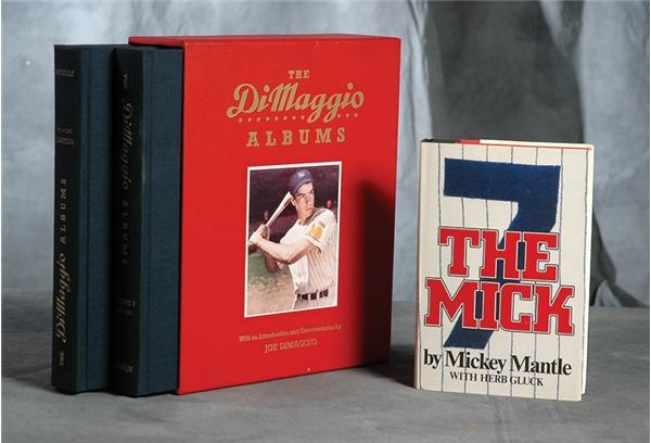 Three books signed by two of the most renowned players of the New York Yankees. First: "The Mick", Mickey Mantle's autobiography that he wrote with Herb Gluck. The item is near mint with dust jacket and is signed "Best Wishes, Mickey Mantle" inside. Second: The two volume set of "The DiMaggio Albums," a collection of photos of and news clippings about The Yankee Clipper. Both books are held in a red slip case and are in Near Mint condition. DiMaggio autographed Volume 1 on the inside flap in black sharpie.