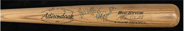 A game-used Big Stick from the decade that saw the Philadelphia Phillies open Veterans Stadium in 1971 and grasp three straight division title wins from 1976-1978. Signed by third baseman Mike Schmidt in thin blue marker next to his imprinted signature, a black-marker-written "32" over Schmidt's team number "20" on the know marks that Steve Carlton, the Phillies' empyreal pitcher at the time, must have favored the bat as well. Well-used and uncracked.