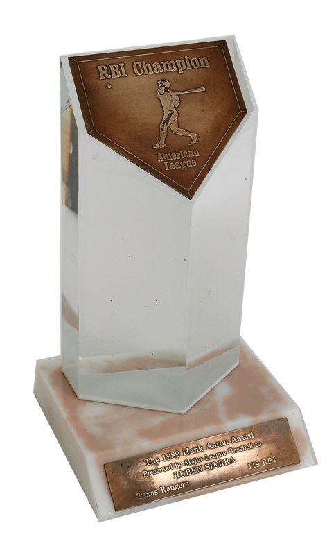 This Hank Aaron Award was given to Sierra in 1989 for being the American League’s RBI Champion. Measuring 13 1/4 inches high, the award was purchased from Sierra himself and is the first such award available from Lelands. Marble base with gold plate on front reading pronouncing its presentation to Sierra. A plastic statue is erected out of the marble base with a gold plate on the face that says “RBI Champion American League” and an engraved picture of a baseball player.