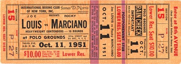 On October 26, 1951 at the Polo Grounds in New York undefeated heavyweight challenger Rocky Marciano fought former champion Joe Louis in an important heavyweight contest. Marciano stopped the aging Louis in the 8th round. Presented here is an official, full, unused ticket for the event which was originally scheduled for October 11th, but was postponed. This was the ticket used for the fight. It is in excellent condition with no creases, stub firmly attached, clean front, bold color and one small glue damage spot on the reverse. A scarce ticket.