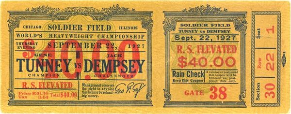 On September 22, 1927, World Heavyweight Champion Gene Tunney defended his title against the man he won the crown from the previous year, Jack Dempsey. Dempsey knocked Tunney down in the 8th round, but referee Dave Barry delayed the count concentrating on getting Dempsey to a neutral corner. Some observers, including Dempsey, felt Tunney was down for 14 seconds. Tunney was able to get up and win a unanimous ten round decision. The fight was forever more known as “The Long Count.” Presented here is a scarce full, unused ticket to the event. The ticket names both fighters and has a beautiful illustrated back with raised lettering. In Excellent condition with no creases, stub firmly attached and bold color. Only slight edge and corner wear and a clean front and back.
