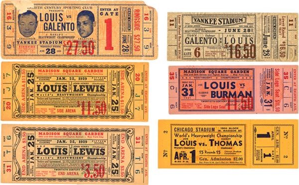Joe Louis won the World Heavyweight Title in 1937 and held that title for eleven years, a record that stands to this day. Presented here are six full, unused tickets from Louis’ glorious reign as champion. Included in this group are two Louis-Lewis Full Tickets (January 25, 1939-EX+), two Louis-Galento Full Tickets (June 28, 1939-EX and illustrated version-VG), Louis-Burman Full Ticket (January 31, 1941-EX), and Louis-Thomas Full Ticket (April 1, 1938-EX). The Thomas and Burman full tickets are quite scarce.