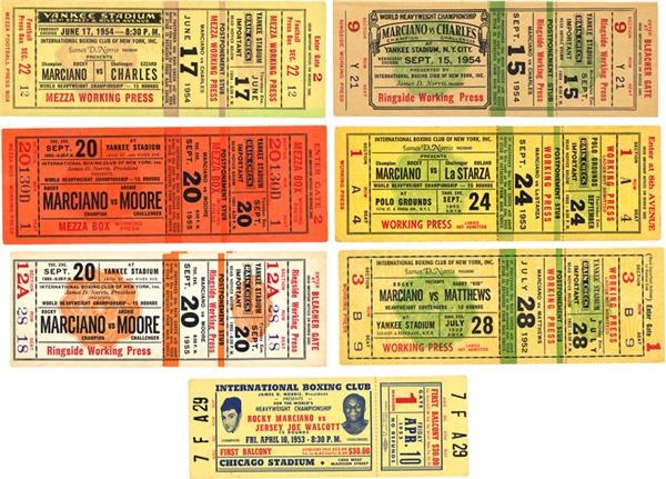 A fine group of official, full, unused tickets from the career of Rocky Marciano, the only man to retire as undefeated World Heavyweight Champion. This beautiful lot includes two tickets from Marciano’s last fight with Archie Moore on September 20, 1955(EX & VG), one ticket from his July 28, 1952 fight with Harry Matthews (EX), one for his postponed fight with Jersey Joe Walcott on April 10, 1953 (EX), one from his fight with Roland LaStarza on September 24, 1953 (VG), one from his fight with Ezzard Charles on June 17, 1954 (EX), and one from his fight with Ezzard Charles on September 15, 1954 (EX).