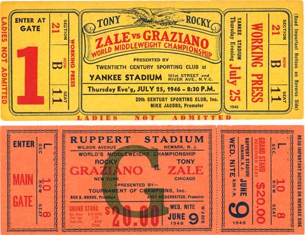 Tony Zale and Rocky Graziano were two of the most dominant middleweight fighters during the 1940’s. They fought three times with Zale winning two and Graziano once. Presented here are two full, unused tickets from their fights. First is the postponed ticket from the July 25, 1946 fight at Yankee Stadium. The fight was actually fought on September 27th with Zale winning by knockout. Second, is the ticket from their June 9, 1948 fight (actually fought the next day) in Newark, New Jersey won by Zale by 3rd round knockout. Both tickets are in Excellent condition with no creases, stubs firmly attached, and clean fronts and backs.